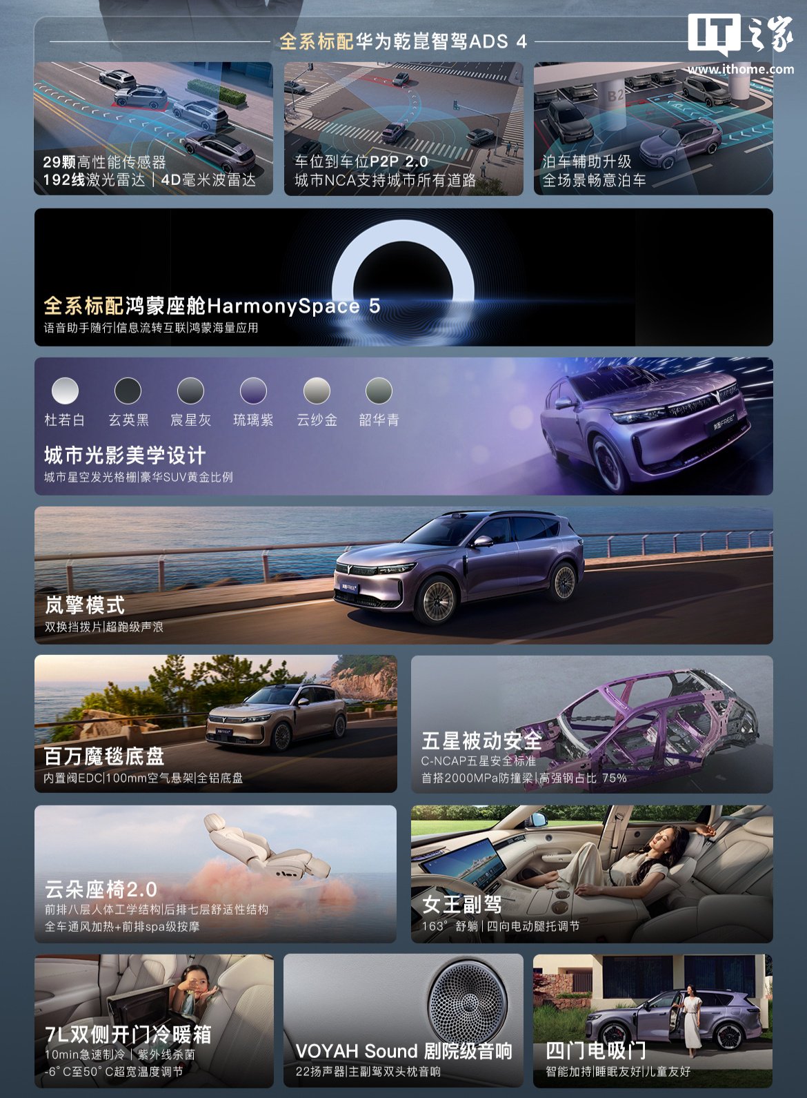 新车全系标配华为乾崑智驾 ADS 4 和鸿蒙座舱 HarmonySpace 5,搭载全铝底盘、EDC 魔毯底盘,并行业首发“岚擎模式”。